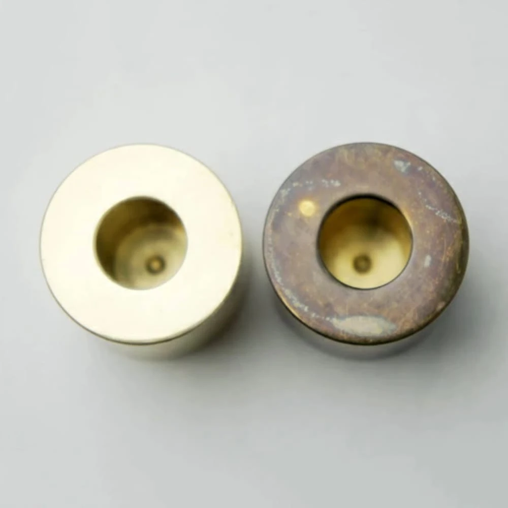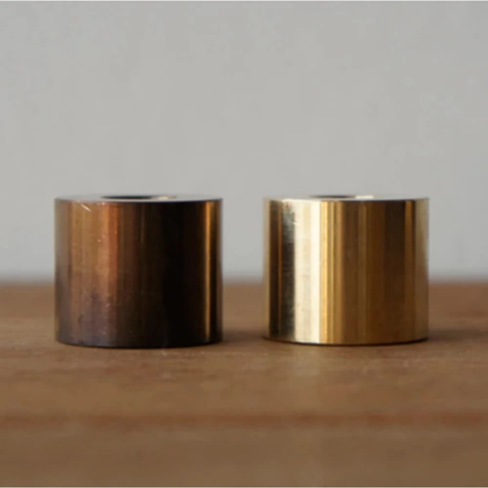 Brass and copper will naturally patina over time. Oil and air will naturally darken this piece and make it shinier. This is part of its natural beauty. Do not use chemicals to clean. If exposed to water or moisture for long periods of time, it may cause the metal to change color quicker or spot.