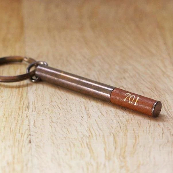This is a key ring made of solid brass and cow leather, designed to look like a room key of a fictional hotel with a luxurious finish.